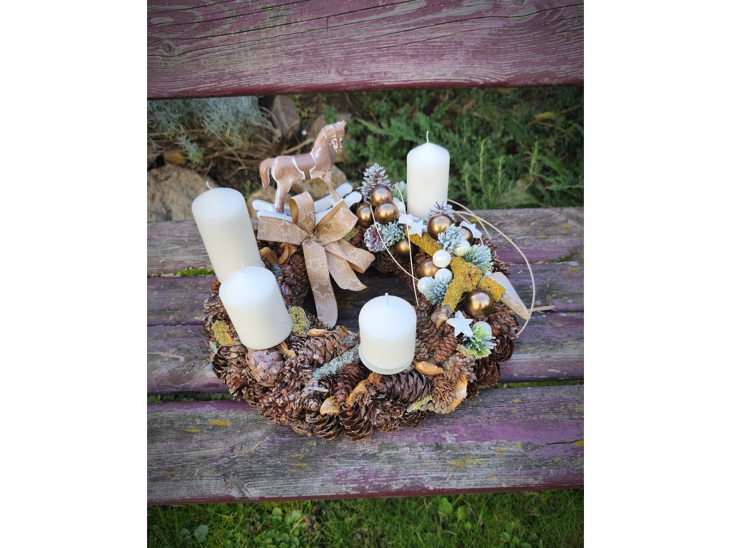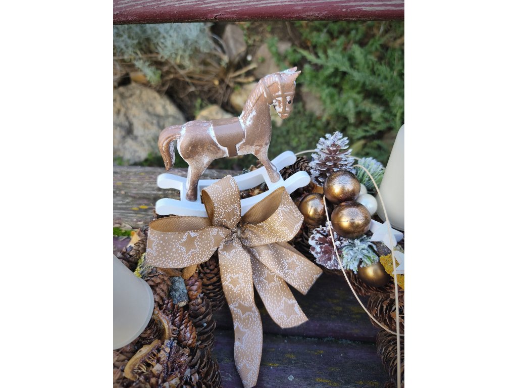 Elegantní adventní věnec v přírodním stylu, zdobený bohatou kombinací šišek, mechu, lišejníku a přírodních doplňků. Dominantou je krásný dřevěný houpací koník, který dodává věnci nostalgický zimní nádech.