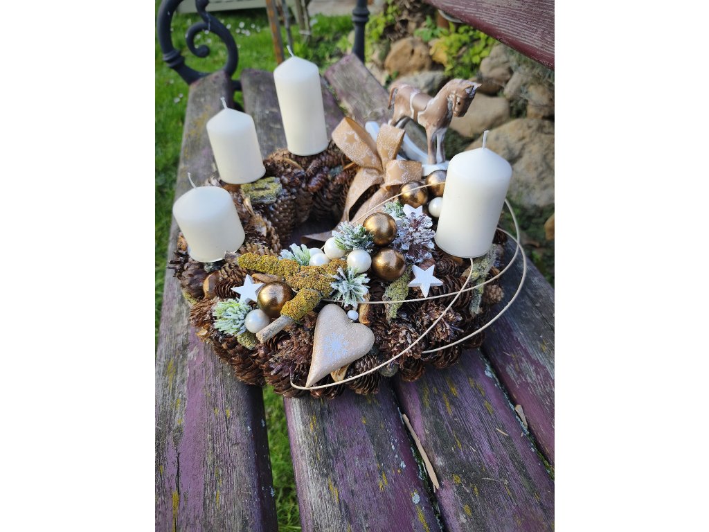 Čtyři světlé svíčky doplňují zlaté a bílé ozdoby, jemně zasněžené větvičky a velká ozdobná mašle – společně vytvářejí harmonickou a teplou vánoční atmosféru.