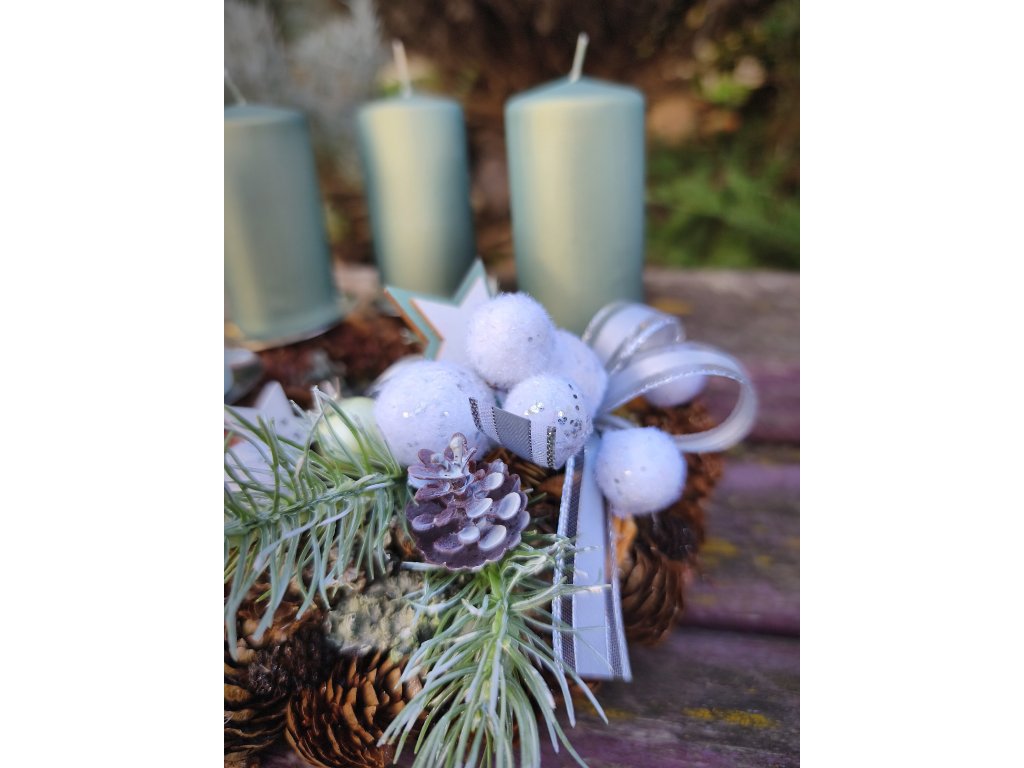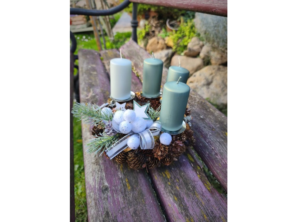 Přírodní adventní věnec laděný do zelených a bílých tónů, které spolu vytvářejí příjemnou zimní atmosféru.