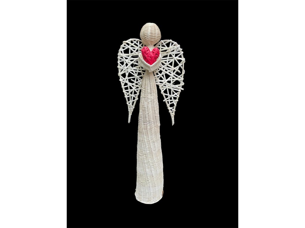Elegantní anděl ručně vyrobený z běleného pedigu zaujme svým jemným vzhledem a symbolikou. V náručí drží červené srdce - detail, který dodává dekoraci nádech lásky a péče.