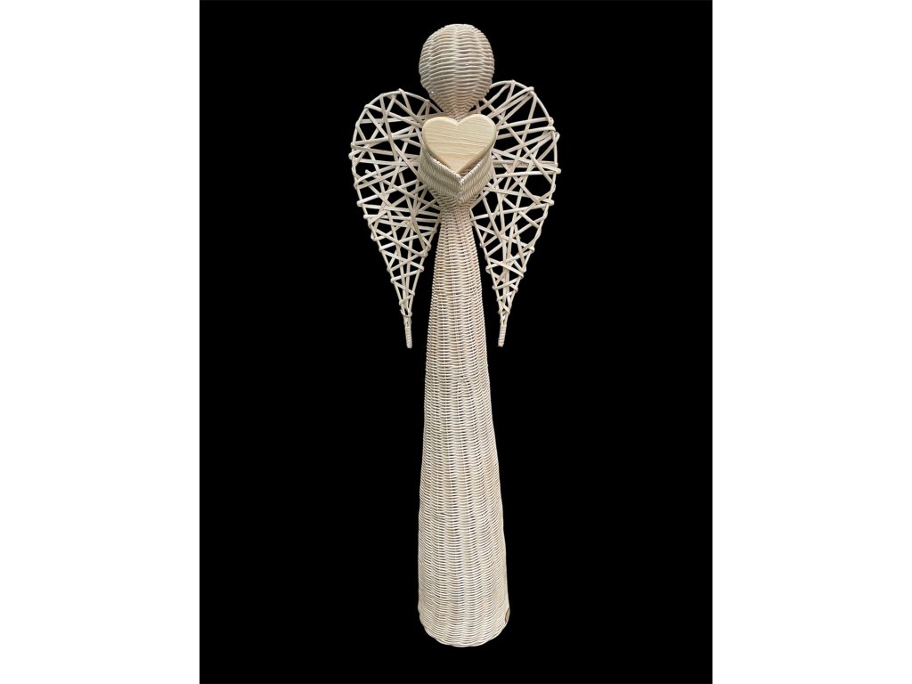 Elegantní anděl ručně vyrobený z přírodního pedigu zaujme svým jemným vzhledem a symbolikou. V náručí drží dřevěné srdce - detail, který dodává dekoraci nádech lásky a péče.