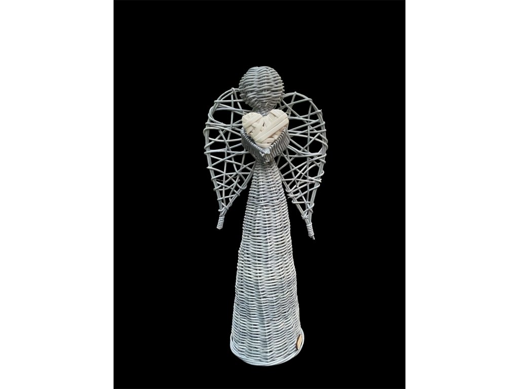 Elegantní anděl ručně vyrobený z šedého pedigu zaujme svým jemným vzhledem a symbolikou. V náručí drží bílé srdce - detail, který dodává dekoraci nádech lásky a péče.
