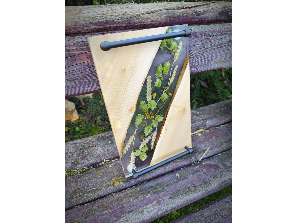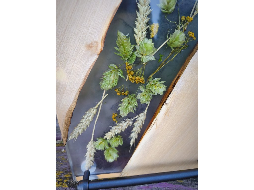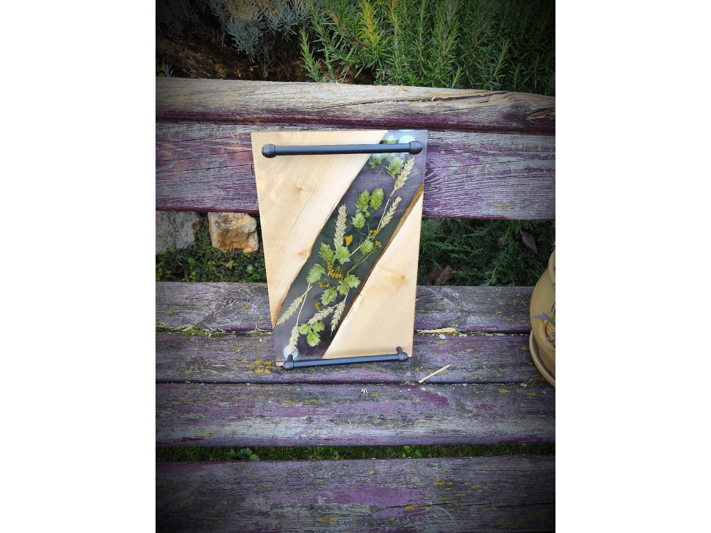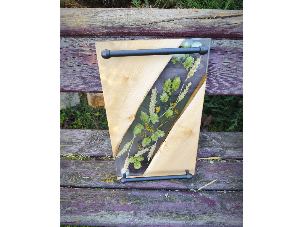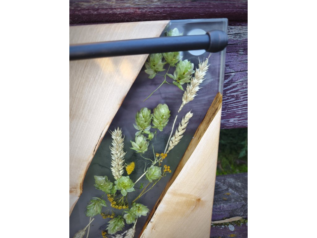 🤎 Materiál: přírodní dřevo, epoxidová pryskyřice, sušené klasy a chmel, kovová madla