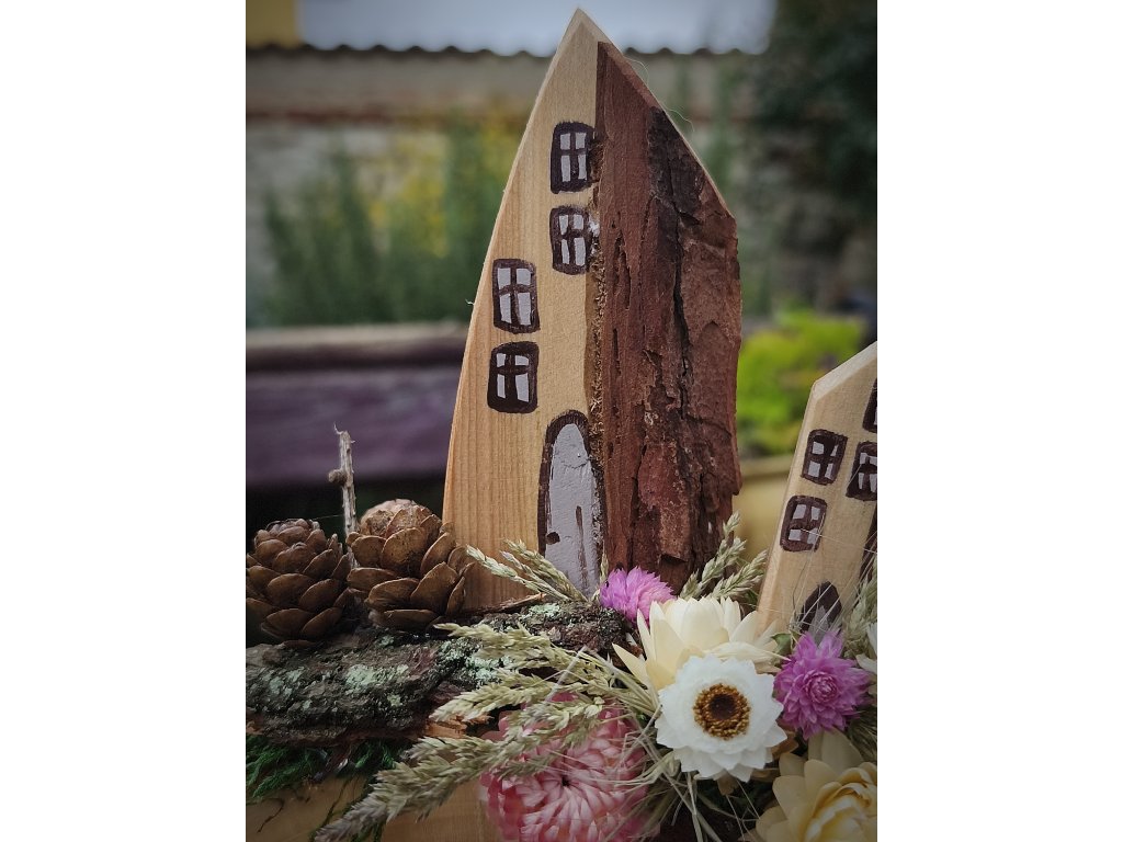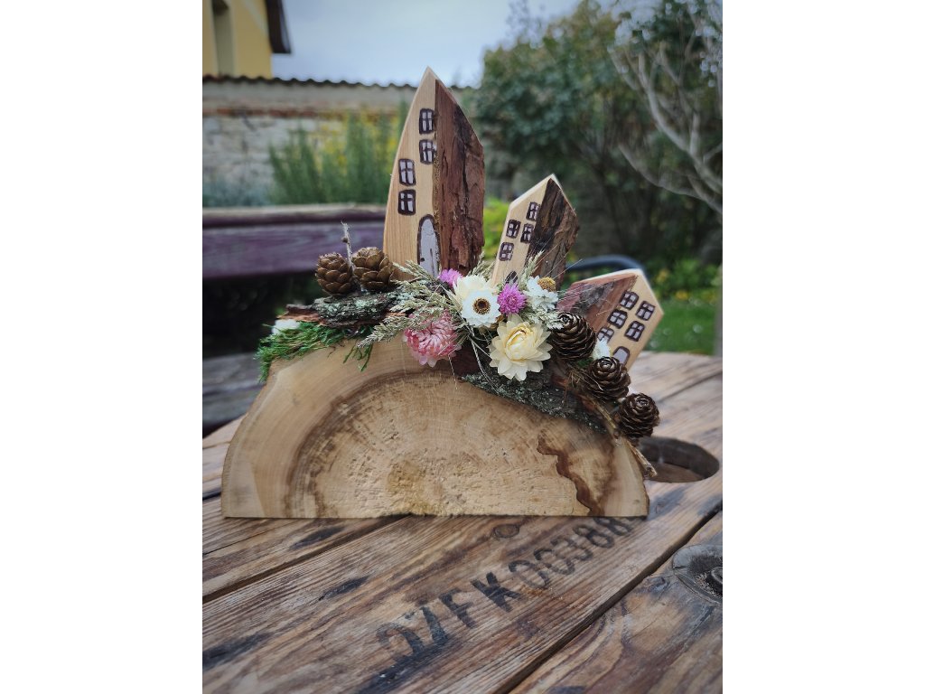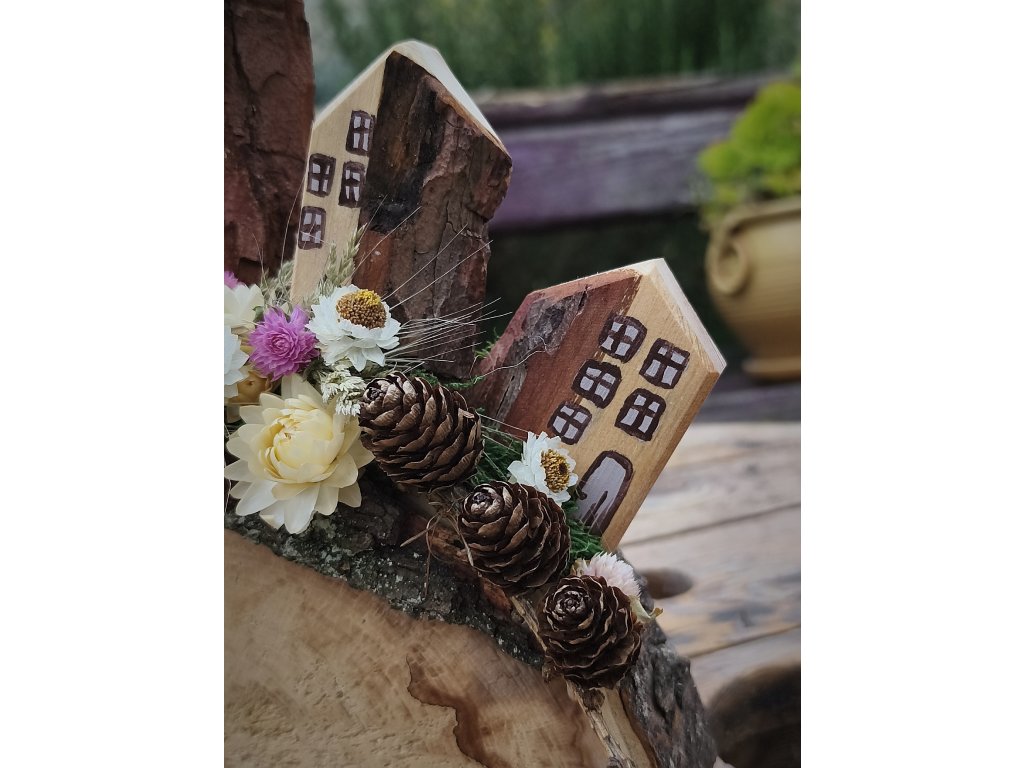 Originální ručně vyráběná dekorace z přírodního dřeva, která zachycuje malebnou scenérii domečků vyřezaných ze dřeva s kůrou. Doplněna je o sušené květy, šišky, mech a další přírodní prvky, které dodávají kompozici živost a teplo.