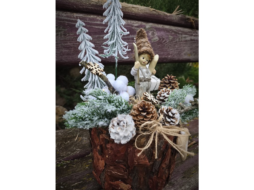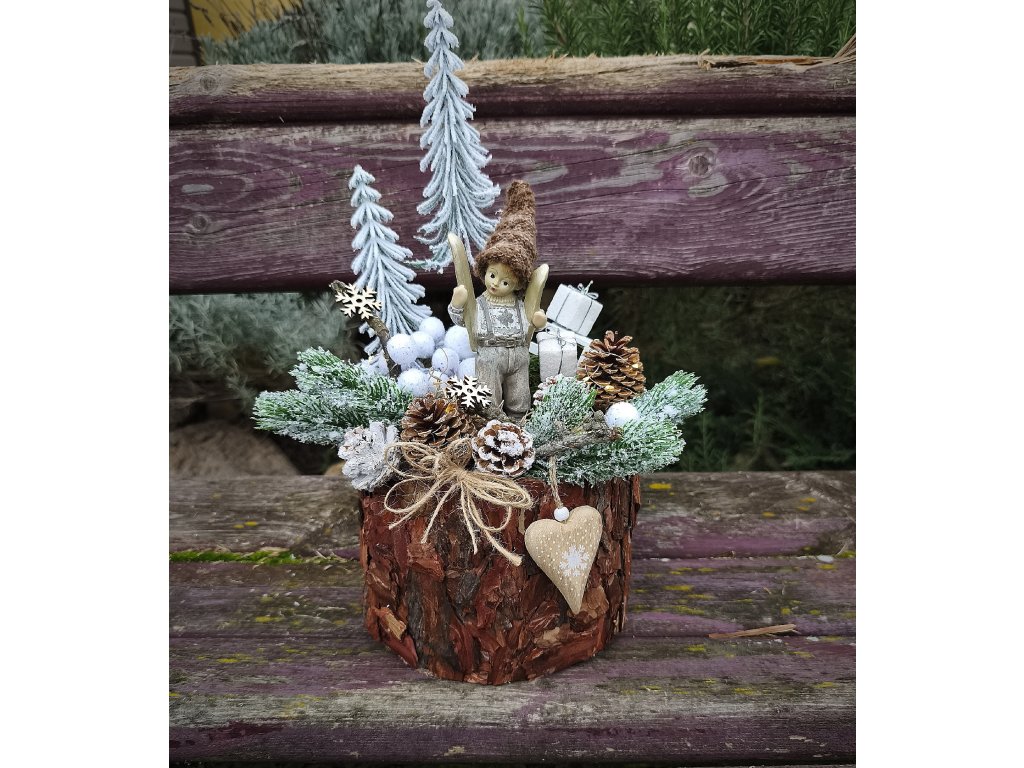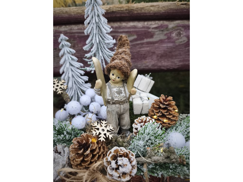 Dekorace je laděná do přírodního zimního stylu – zasněžené stromky, dřevěná základna, postavička panáčka s lyžemi, přírodní šišky, mech, drobné zimní ozdoby v bílo-krémových tónech a jemné detailní dekorování.