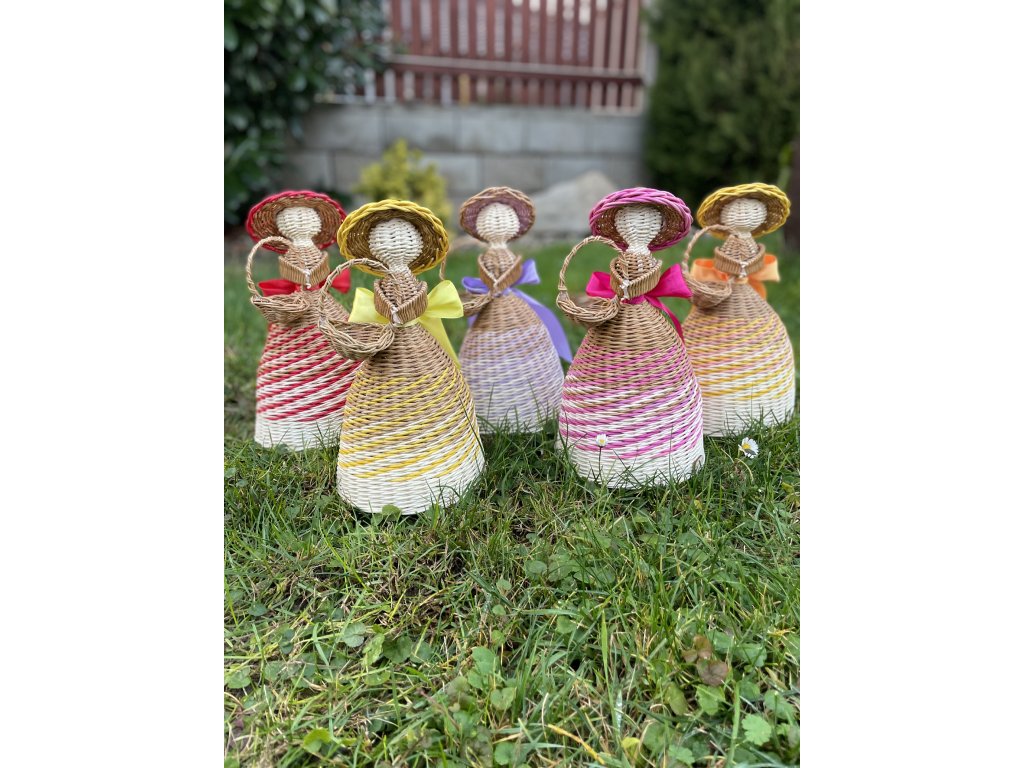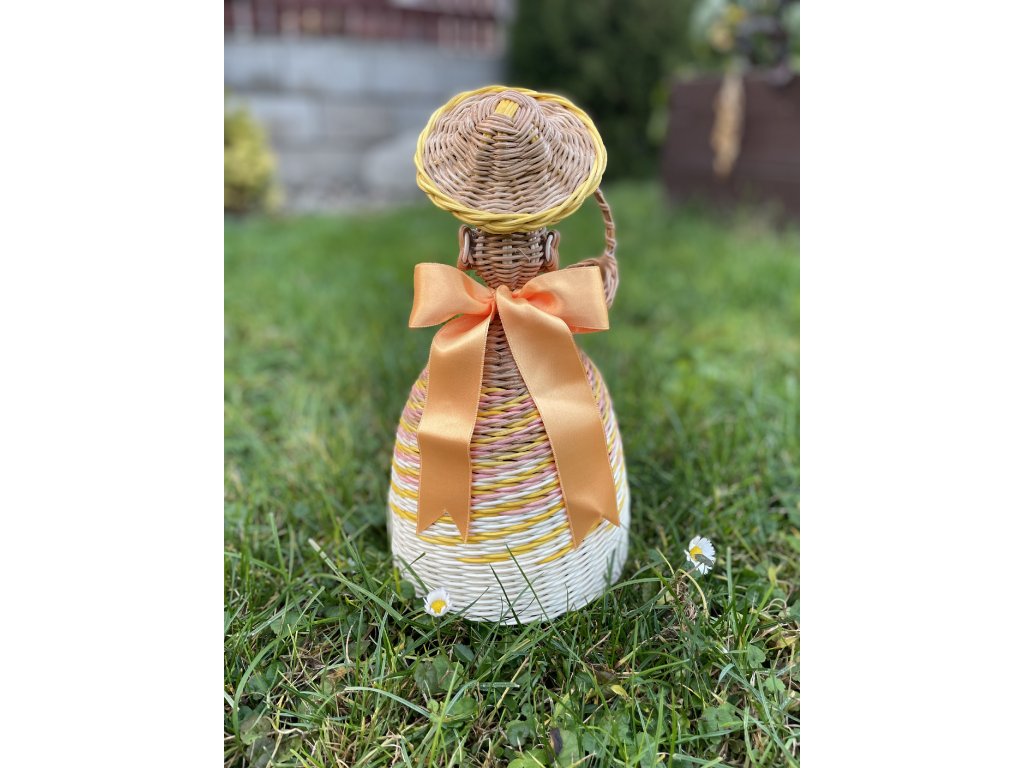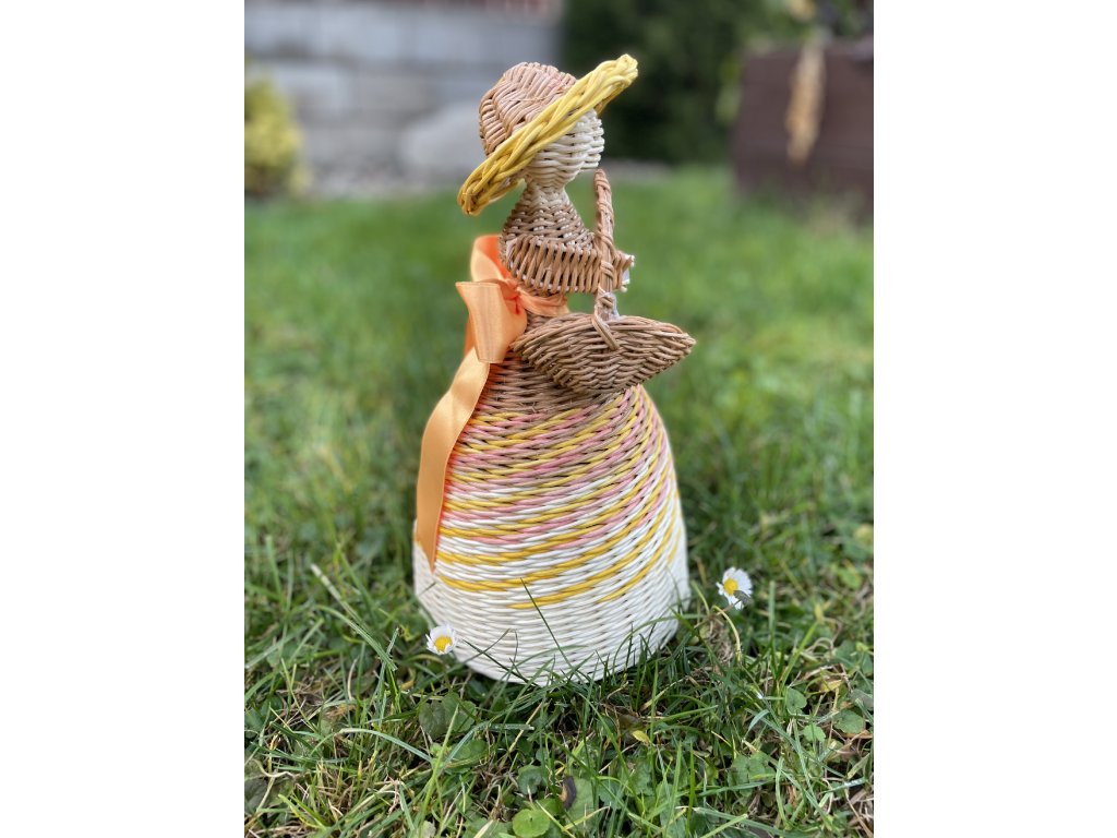 Tato okouzlující ručně pletená panenka vnese do každého interiéru nádech venkovského šarmu a originality. Každý detail, od roztomilého kloboučku, přes stylovou mašli v pase, až po drobný košíček, je výsledkem pečlivé ruční práce z přírodního materiálu. Panenka je vyrobena s láskou k detailu a je ideálním doplňkem do dětského pokoje, nebo jako originální dárek pro milovníky řemeslných výrobků, k Vánocům nebo narozeninám.