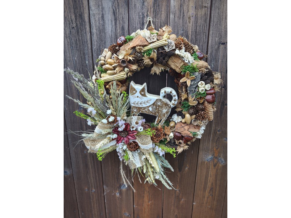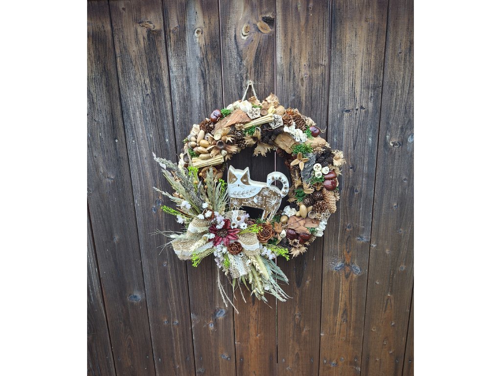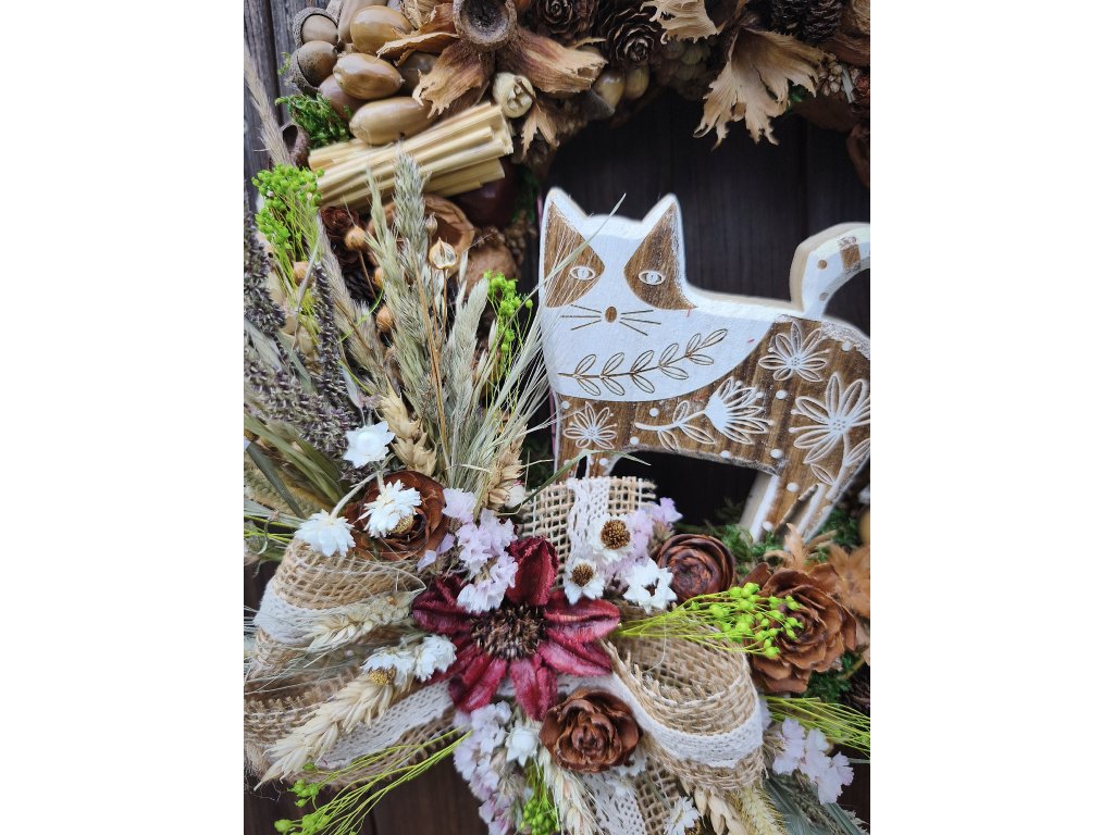 Originální ručně vyráběný věnec v přírodním stylu, ozdobený dřevěnou kočkou, šiškami, žaludy, kaštany a sušenými rostlinami. Kombinace přírodních materiálů, sušených květů, obilí a jutových mašlí vytváří útulný a hřejivý podzimní vzhled.