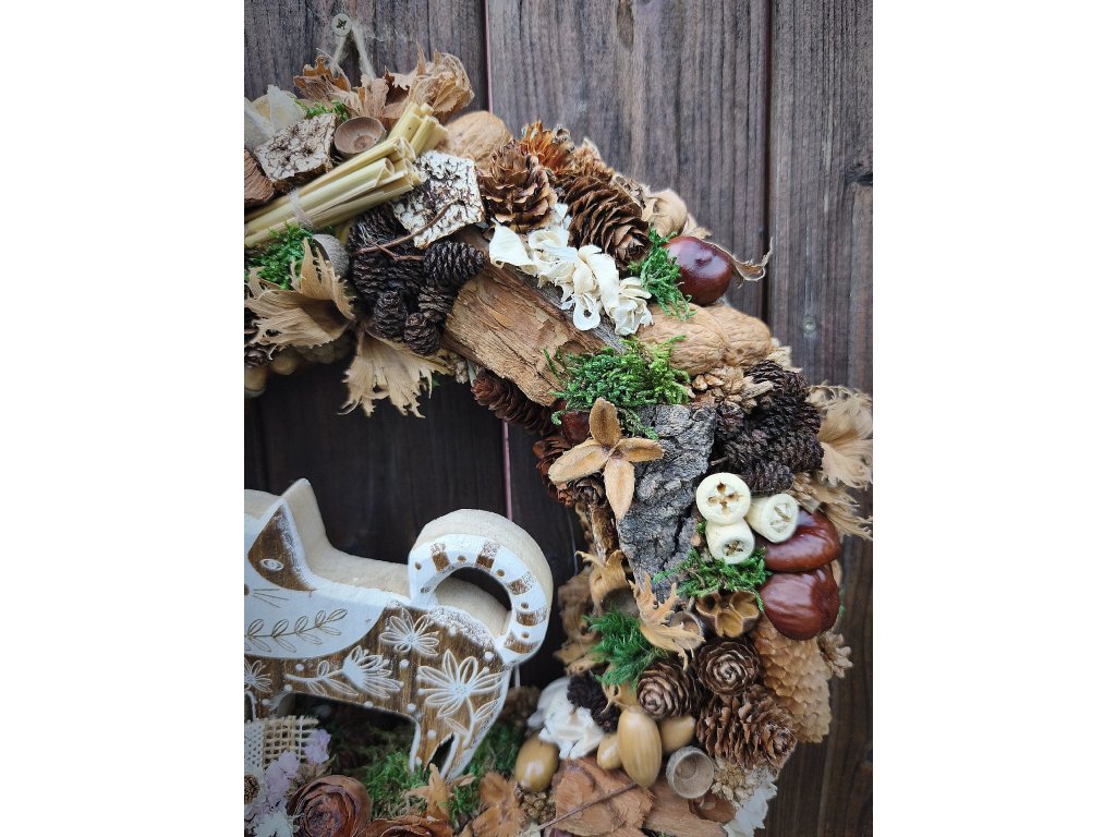 🤎 Materiál: přírodní šišky, žaludy, sušené květiny, trávy, juta, dřevo