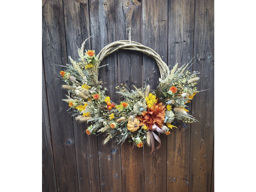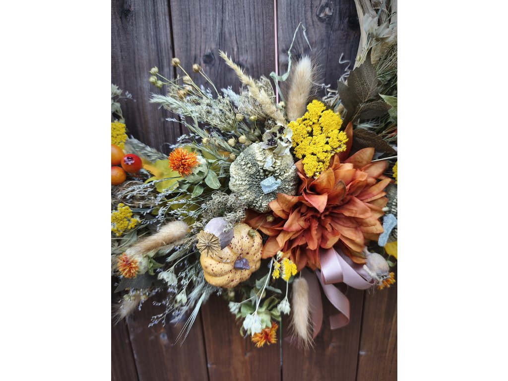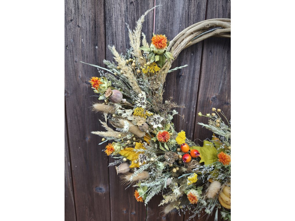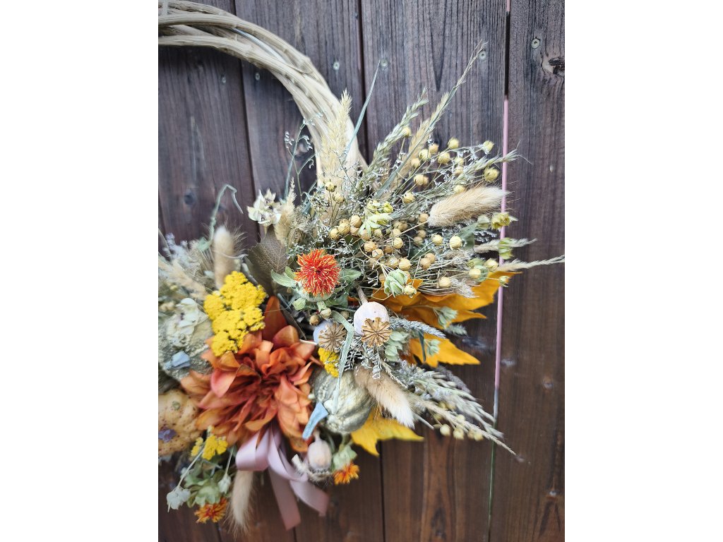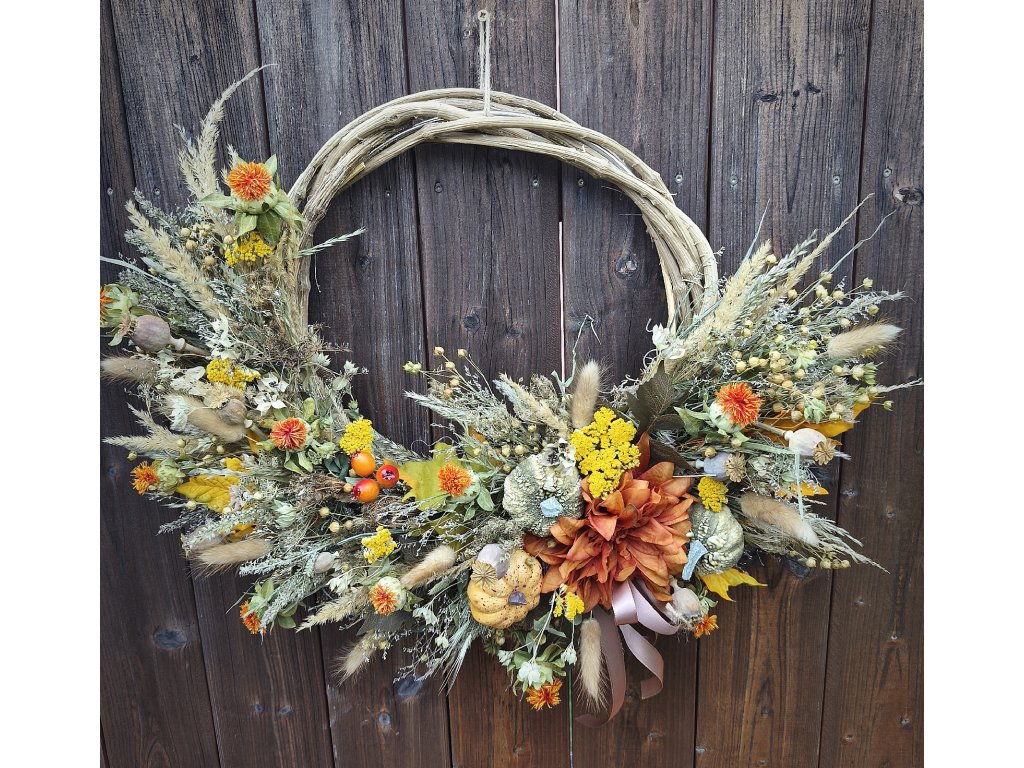 🤎 Materiál: proutí, sušené květiny, trávy, makovice, dýně, bobule, stuha