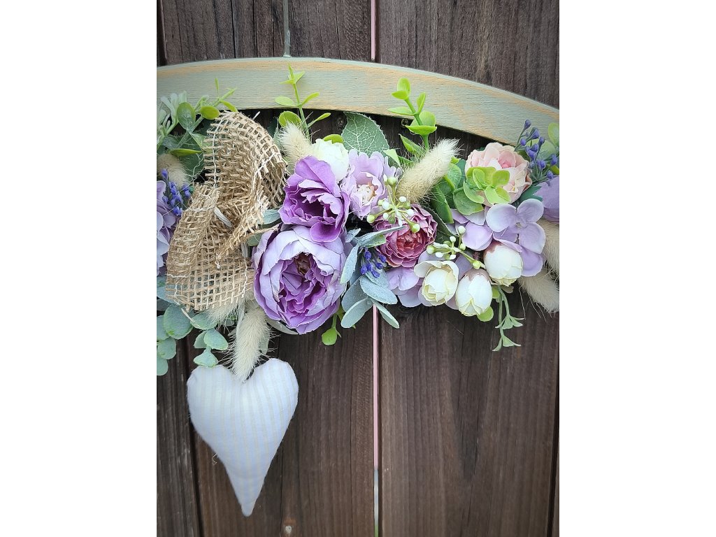 Romantická závěsná dekorace na dřevěném ramínku, ozdobená levandulově fialovými květy, eukalyptem, jemnou zelení a jutovou mašlí. Uprostřed je zavěšené textilní srdíčko, které dodává aranžmá něžnost a kouzlo domova.