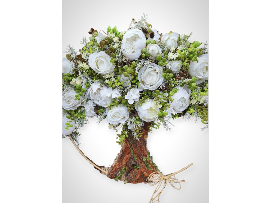 Krásná ručně vyráběná dekorace ve tvaru stromu, ideální pro zavěšení na stěnu či dveře. Kombinace přírodních materiálů, kůry, zeleně a bílých květů působí elegantně a jemně. Strom symbolizuje sílu, růst a harmonii – perfektní doplněk pro váš domov, svatební výzdobu nebo dárek pro milovníky přírody.