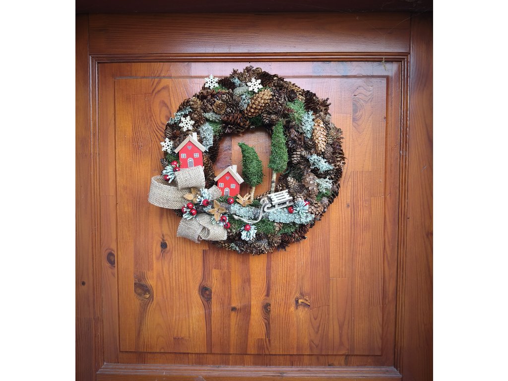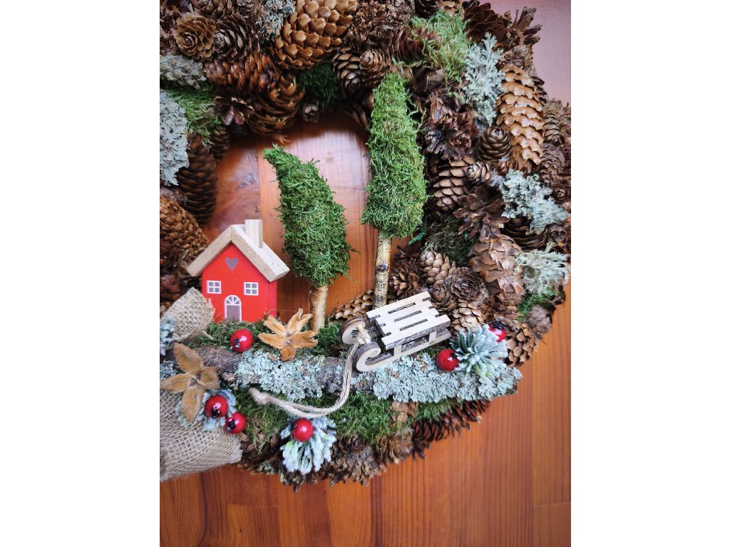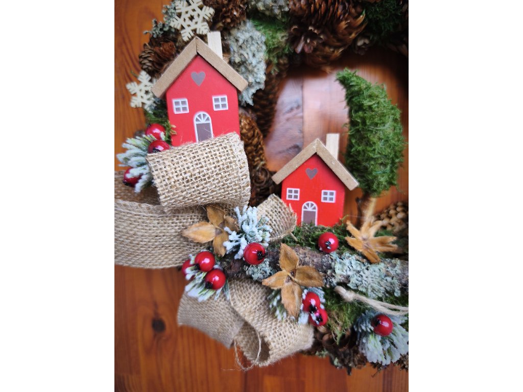 Nádherný přírodní vánoční věnec bohatě zdobený šiškami, mechem, lišejníkem a přírodními plody. Dominantou dekorace je malá zimní vesnička – dva červené domečky, mechové stromky a dřevěné sáňky, které dodávají věnci pohádkový vzhled.