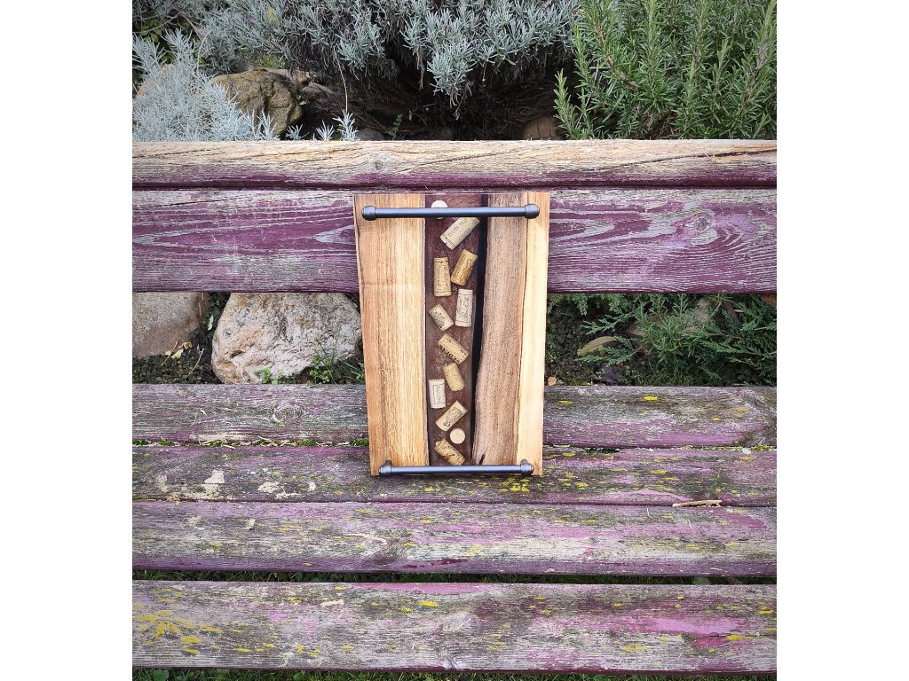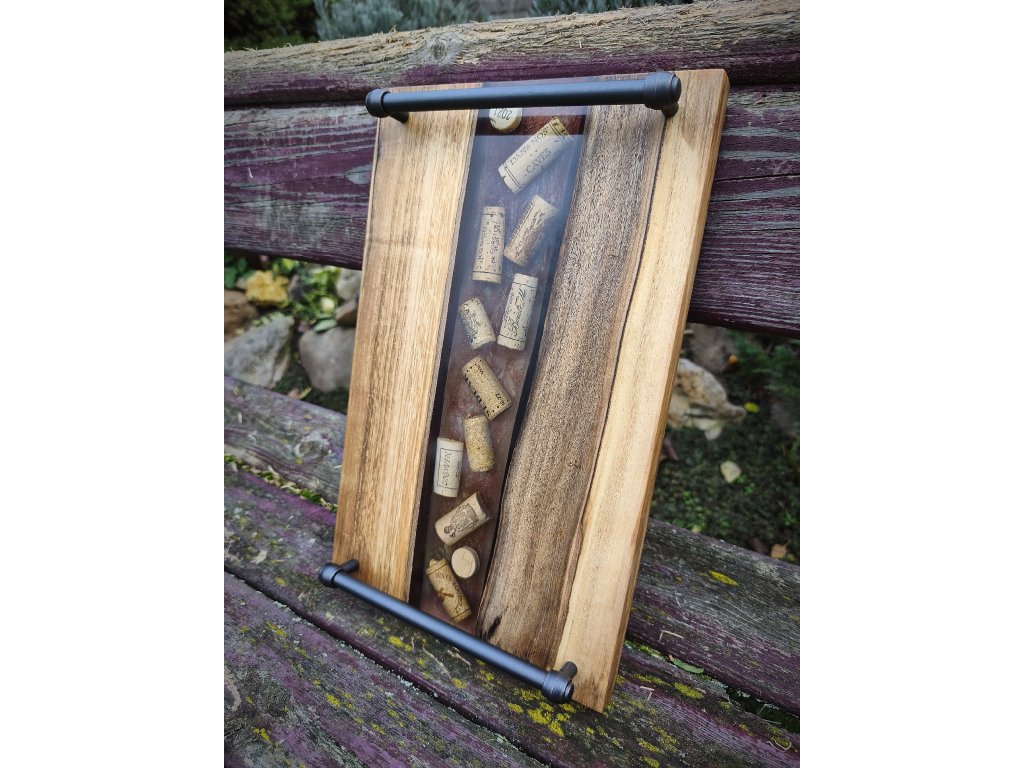 Tento originální podnos kombinuje přírodní krásu ořechového dřeva s jedinečnou dekorací z vinných korků. Středová část je zalitá pryskyřicí, která korky krásně zvýrazní, zafixuje a dodá podnosu luxusní vzhled.