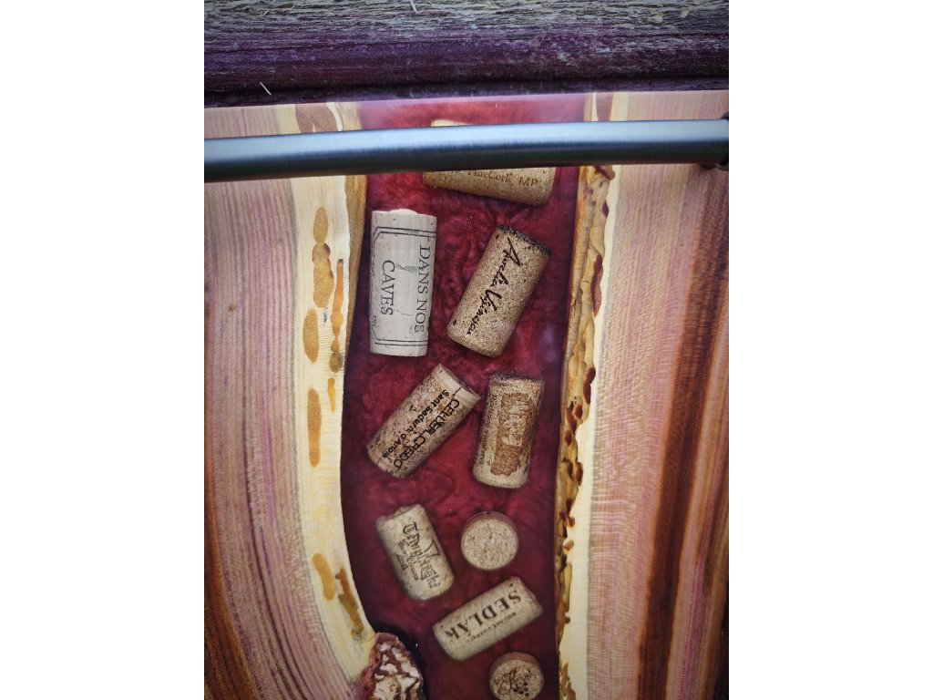 Elegantní podnos, který spojuje nádhernou kresbu ořechového dřeva s originálním prvkem – korky z vinných lahví vsazenými do pryskyřice v hlubokém červeném odstínu. Barevný kontrast mezi teplým tónem dřeva a vínovou pryskyřicí dodává podnosu luxusní, moderní vzhled.